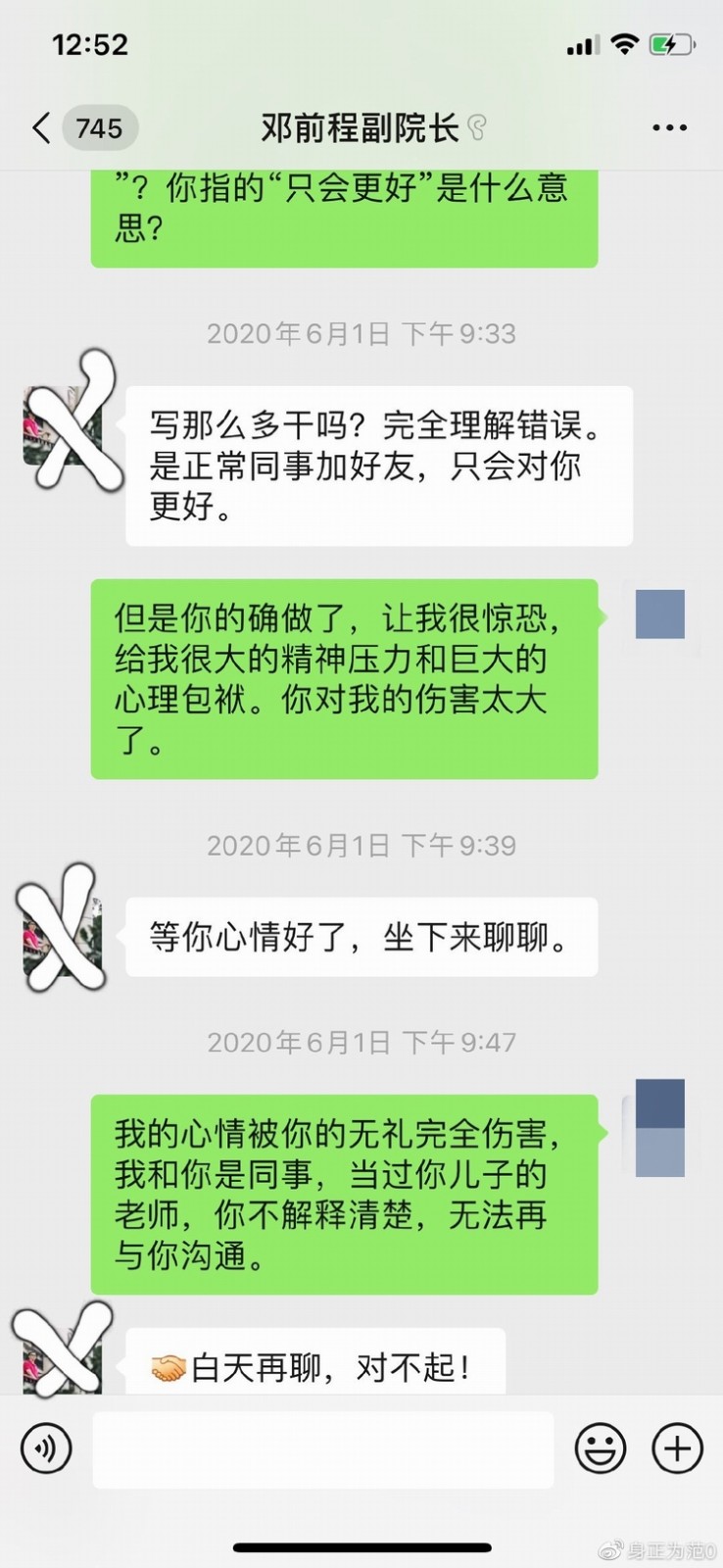 7月3日0时许,微博网民@身正为范0发帖称,“四川师范大学高研院副院长邓前程公然凌辱女教师,致其精神障碍”,并附上疑似邓前程与受害者的聊天记录截图以及受害者病情诊断书。