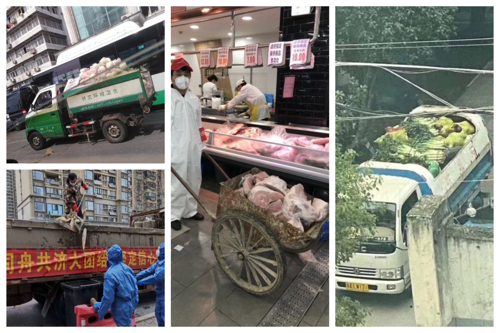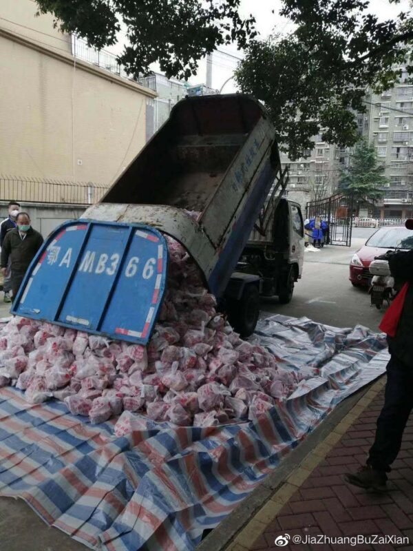 武汉社区被曝出用垃圾车运送蔬菜等物资。(图片源于网络