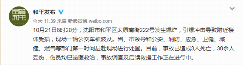 据沈阳市和平区委宣传部官方微博“和平发布”通报称,10月21日8时20分左右,位于沈阳市和平区太原南街222号(王二牛烤骨头店)发生爆炸,引爆冲击导致附近楼体受损,现场一辆公交车被波及。目前,事故已造成3人死亡,30余人受伤。