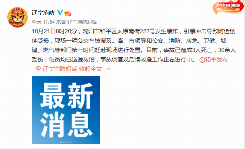 另据“辽宁消防”官微消息称,初步判定现场为商住楼楼内爆炸。目前,事故已造成3人死亡,30余人受伤,伤员均已送医救治,事故调查及后续救援工作正在进行中。