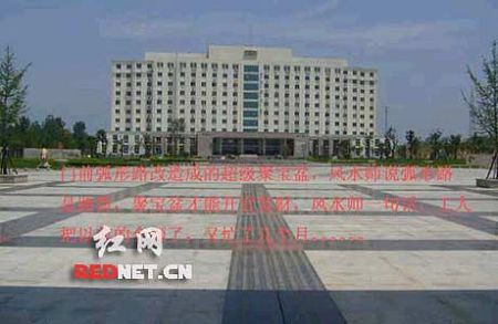 看了这组照片,网友“了然真人”跟帖补充说,“那一眼望不到边的县委大楼南边的广场原来是一条60米宽的道路,名叫府前大道,耗资3000多万才建成。县委书记请来了一位西安的所谓大师,该大师对县领导说:这条道路正对着你的办公室,称为‘穿心箭’,主凶。领导一听,命人砸烂才启用了不到一个星期的府道大道,楼主拍的广场照片就是道路被砸碎又建的。”