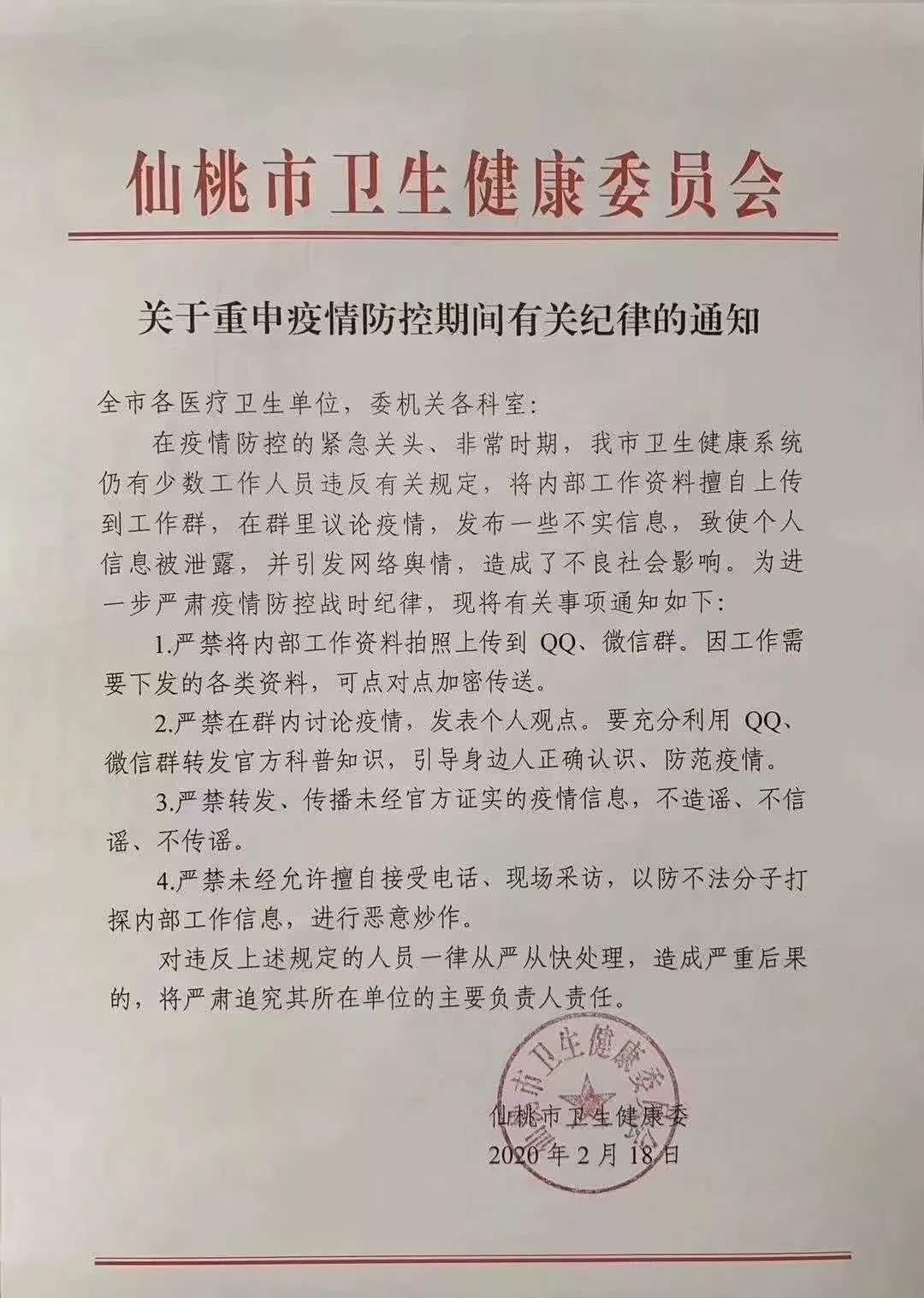 仙桃市卫健委下发一份关于言论管控的通知,遭到舆论谴责后被官方声明“作废”。(图片来源于网络)