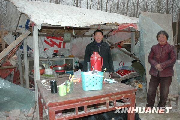 拆迁户韩光勇和妻子范恒芳站在棚子门口,泣不成声