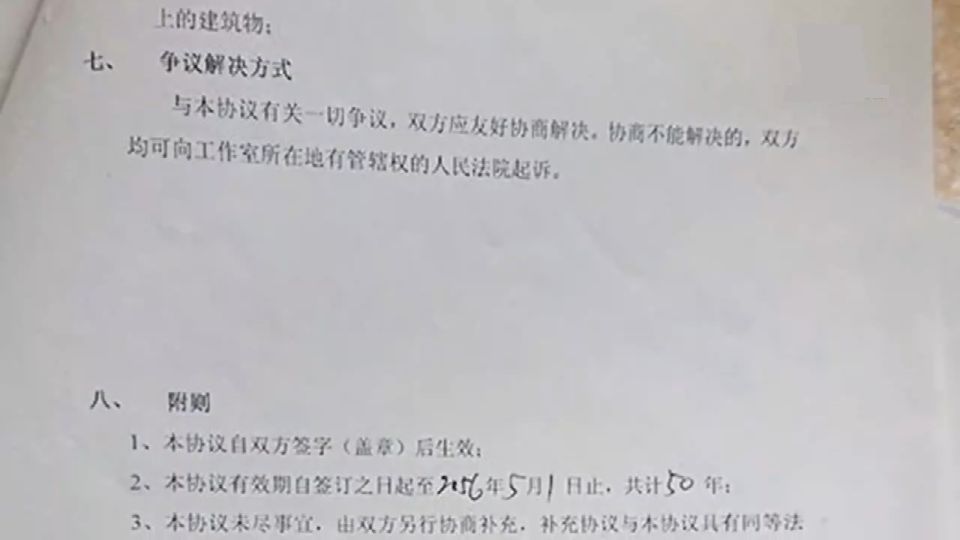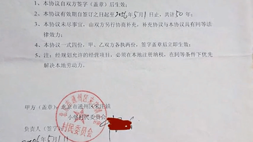 2006年5月1日签订50年租期协议,北京通州区宋庄镇小堡村文化创意产业园区入园协议书,小堡村村民委会(视频截图)