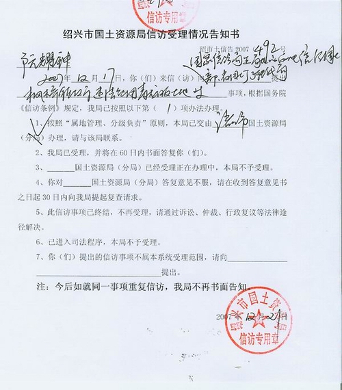 绍兴市国土资源局受理情况告知书